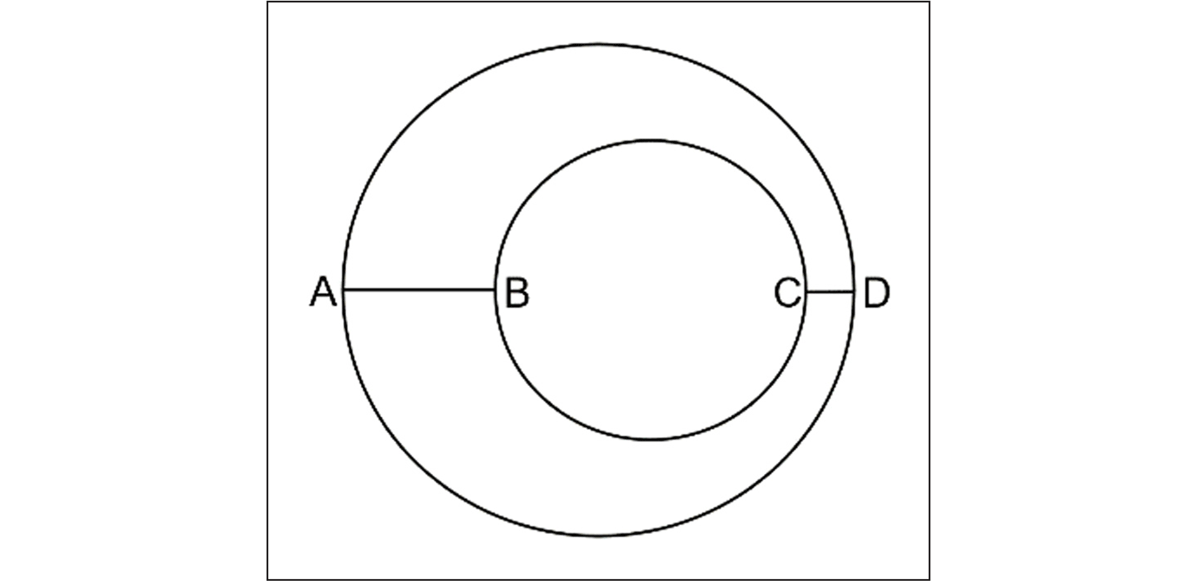 For example [see Figure 1], all the inequalities of the space between two circles, A and B, and all the variations which the matter moving in it must undergo, exceed every number. That is not inferred from the excessive size of the intervening space. For however small a portion of it we take, the inequalities of this small portion will still exceed every number. Nor is it inferred because, as happens in other cases, we do not know its maximum and minimum. For we know both in this example of ours: AB is the maximum and CD is the minimum. Instead it is inferred simply from the fact that the nature of the space between two non-concentric circles does not admit anything of the kind. So if anyone should wish to determine all those inequalities by some definite number, he will, at the same time, have to bring it about that a circle is not a circle. (Ep. 12, G IV.59–60/C I.204)31